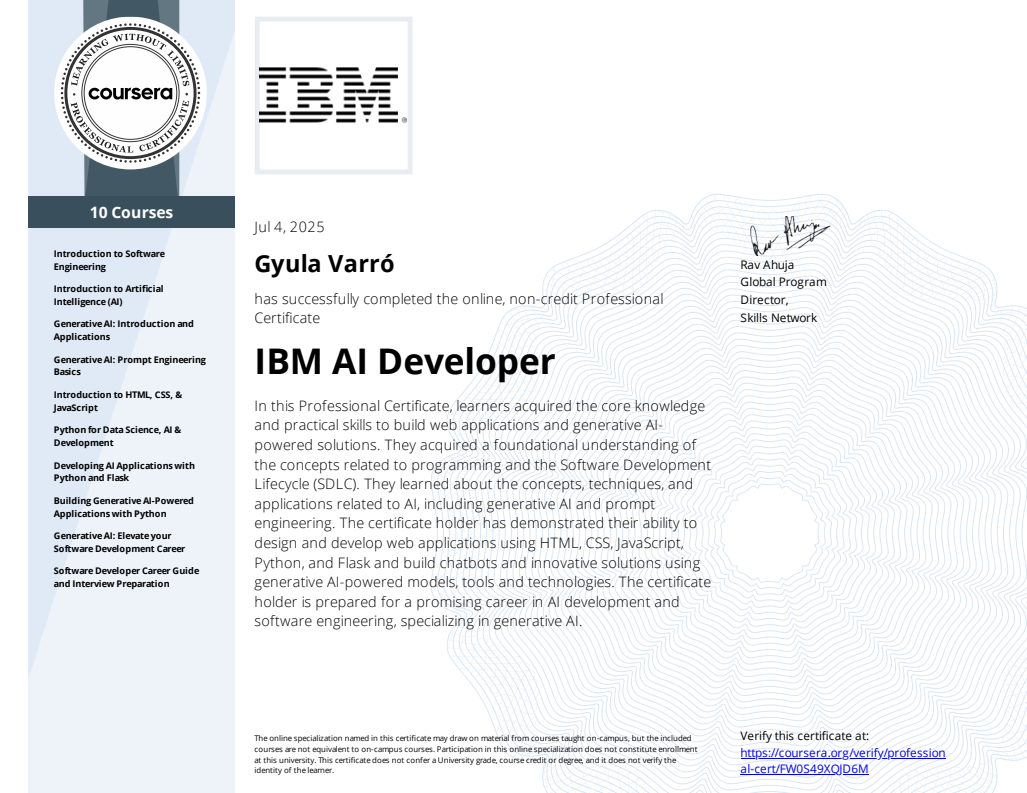 Sikeresen megszereztem az IBM AI Developer minősítést a Coursera keretében. A tíz kurzusból álló programban az AI-fejlesztés, szoftvermérnökség, HTML, CSS, JavaScript és Python területein mélyítettem a tudásom.