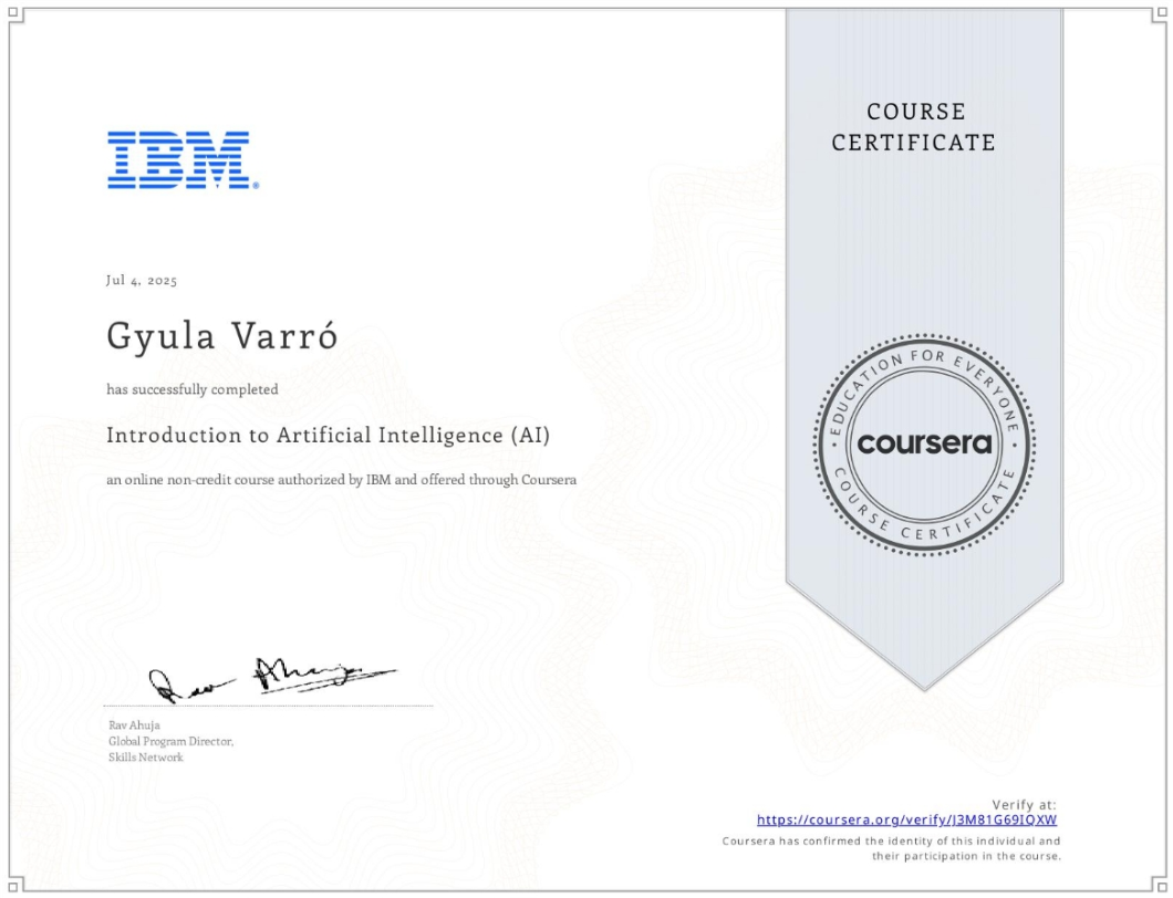 Elvégeztem az IBM x Coursera “Introduction to AI” kurzust: alapfogalmak, működés és főbb alkalmazási területek – gyakorlati fókuszban.