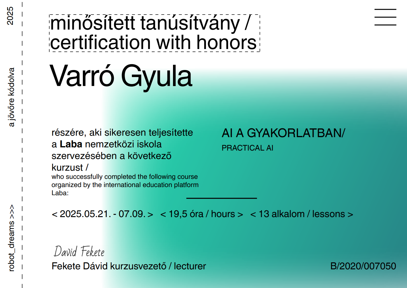 2025 – 2025Az "AI a gyakorlatban" képzés során elsajátítottam a legújabb generatív AI eszközök – mint a GPT-4o, Copilot és más modern AI-technológiák – hatékony használatát valós üzleti és fejlesztési helyzetekben. A tanfolyamot a Robodreams szervezte, és külön hangsúlyt fektetett a produktivitásnövelésre, automatizálásra és AI-integrációra.